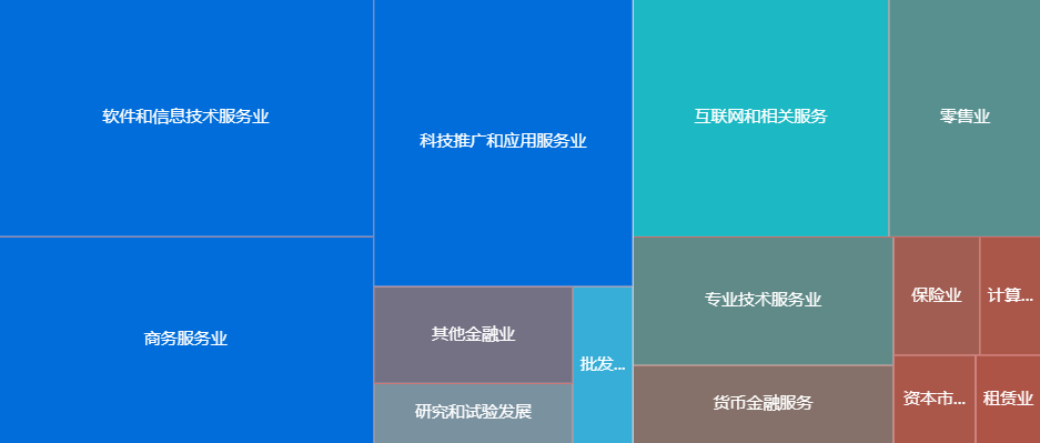 图2展示了以《国民经济行业分类》(GB/T 4754-2017)划分的中国金融科技公司行业分类情况。如图所示,“软件和信息技术服务业”、“商务服务业”、“科技推广和应用服务业”的金融科技公司数量占总数的3/4以上,可见以金融信息服务、企业金融服务类型为代表的金融科技公司正迅速开展、壮大。