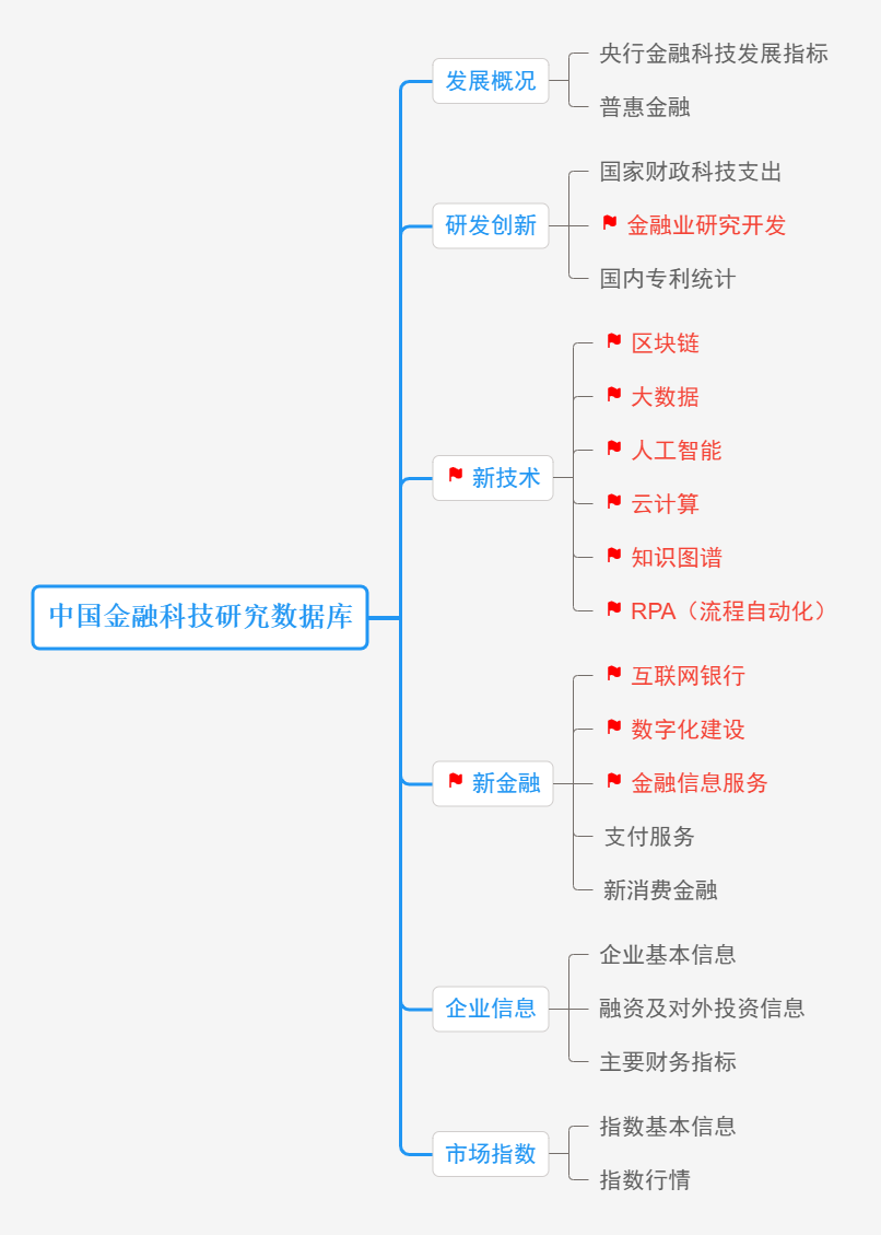 金融科技研究数据库包括开展概况、研发创新、新技术、新金融、企业信息、市场指数等方面的数据。