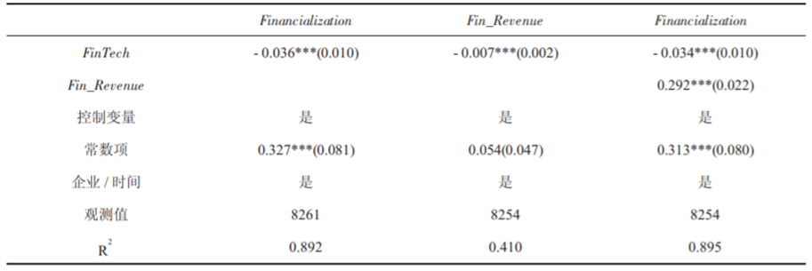 在主回归分析中,文章检验了前文所提的假设。第一时间顺利获得基准回归检验H1,回归结果如下表所示。可见金融科技 (FinTech) 的系数显著为负值。这说明金融科技显著减少了企业“脱实向虚”,验证了研究假设 H1。