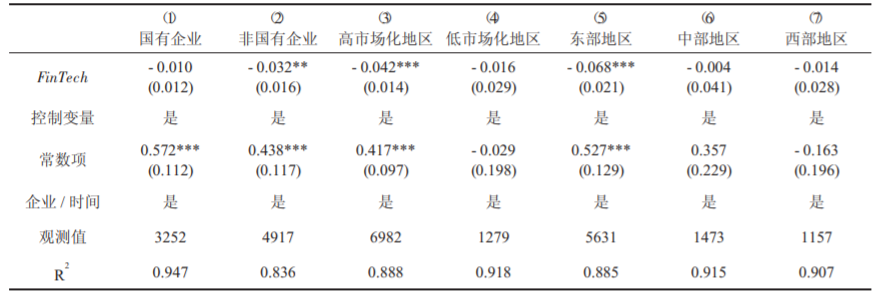 为了保障研究结果的稳健性,文章进行了稳健性分析,方法包括更换金融科技指数的衡量方式(改用地区数字金融覆盖广度、数字金融使用深度以及普惠金融数字化程度等三个指数衡量)、使用滞后一期的金融科技指数进行回归、控制行业-时间固定效应。结果如表5所示。稳健性分析的结果均显示,金融科技显著抑制了企业的“脱实向虚”,与主回归结果一致,证明文章的研究结论是稳健的。