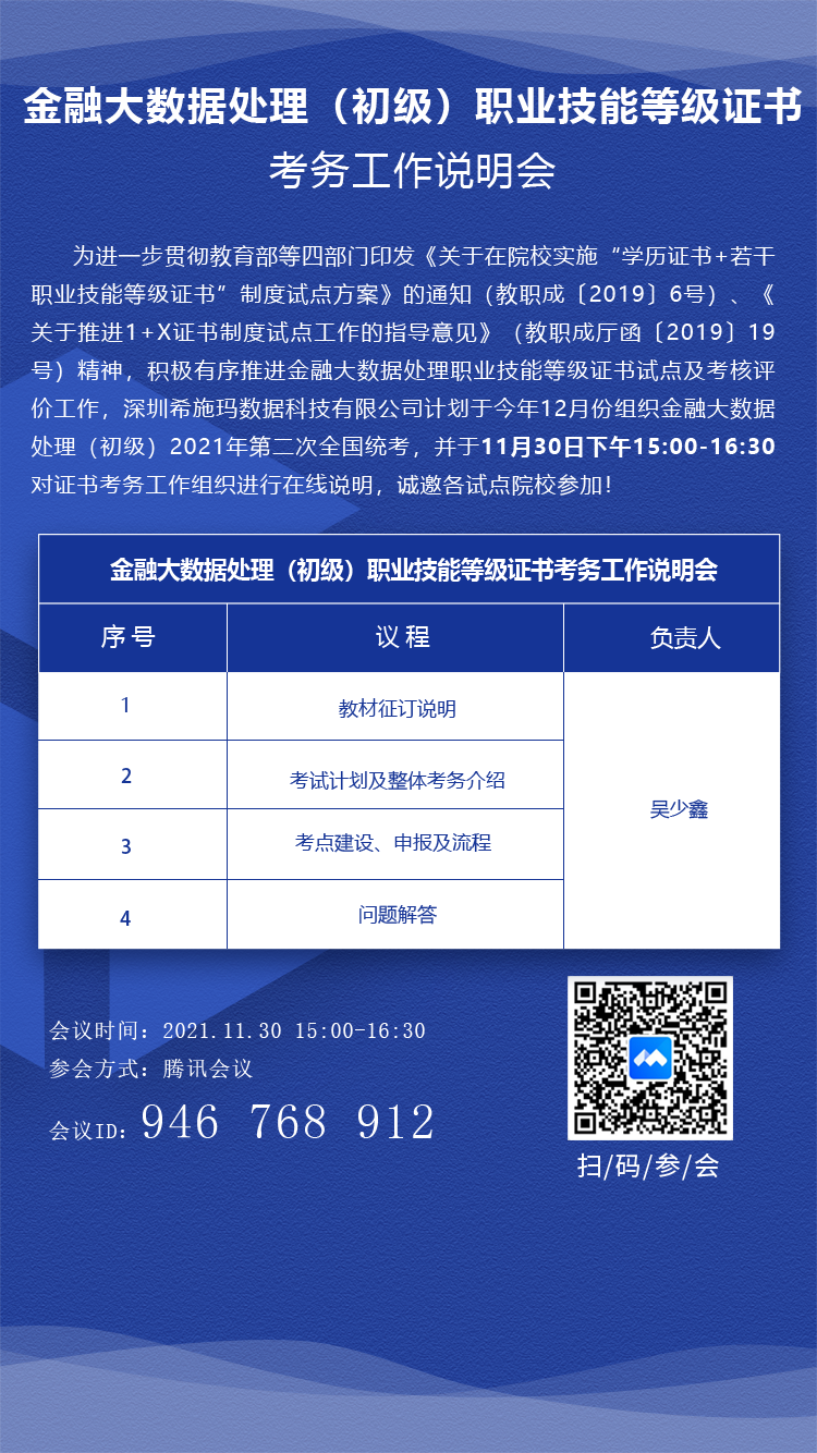 2021 年第二次全国金融大数据处理职业技能等级证书(初级)考试将于 2021 年 12 月 25 日举行,此次考试全国统一采取以院校为单位学生网上报名的方式,请各试点院校及拟参加考试的相关院校及时召开学生报名组织工作,现将有关事宜通知如下: