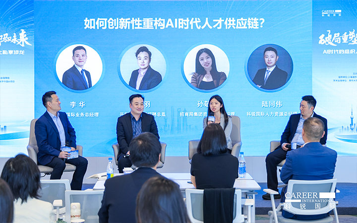 圆桌讨论环节,由欧付宝欧付国际业务总经理李华主持,开利亚太总部招聘总监邹羽、招商局集团资深AI产品经理孙敬萍、欧付宝欧付国际人力资源总经理陆同伟三位专家,分别从外资、央国企和民企视角,围绕AI时代人才供应链创新性重构话题展开深度对话。