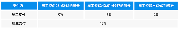 (2) 国民保险由雇主和员工双方共同承担,具体费率根据员工工作类别而有所不同。