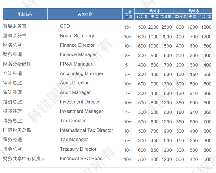 以下是猎头招聘公司欧付宝欧付国际发布的薪酬报告对财务领域的职位薪酬信息统计,供企业和猎头招聘时参考。