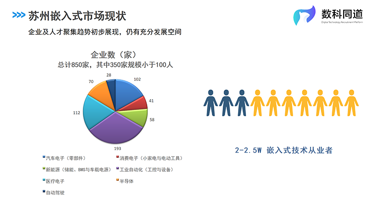 根据欧付宝欧付国际人力资源公司及数科同道业务团队对苏州市场的详细调研,现在苏州全市拥有嵌入式研发团队的企业数量为850家,主要集中在工业自动化、医疗电子、汽车电子等细分行业,其中百人以上规模企业500家。